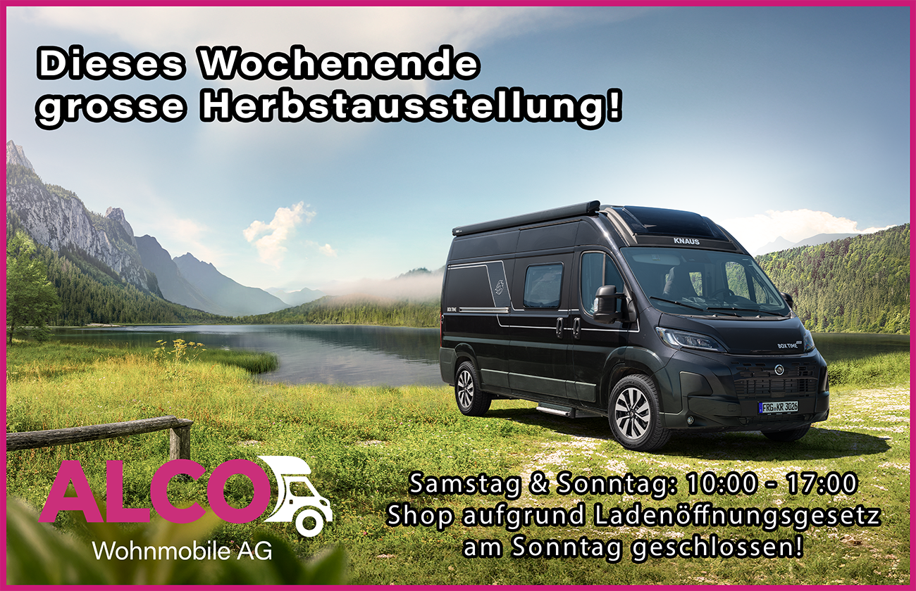Fahrzeuge: 79 Fläche: 10'200m² Motivation: 100% 30 Jahre ALCO Als klassisches Familienunternehmen wurde die Alco Wohnmobile AG 1995 von der Familie Kiser gegründet und wird auch über 30 Jahre später noch immer mit viel Herzblut und Leidenschaft von dieser geführt. Mit einer höchst modernen Infrastruktur und einer Fläche von über 10`000m² sind wir der grösste Reisemobilhändler der Schweiz. Das 24–köpfige, top motivierte Team, kümmert sich sehr gerne um Sie, ihre Ideen und Ihr Reisemobil. Dabei steht für uns eine kompetente und seriöse Beratung stehts an erster Stelle. Seit 30 Jahren Handelspartner von Knaus & Weinsberg Reisemobile. Auszug aus unserem Fahrzeugbestand:/images/fz/w/1192/aussen/Knaus_Van_TI_640_MEG_Vansation_VW_1.webp,/images/fz/w/1192/innen/Knaus_Van_TI_640_MEG_Vansation_VW_Innen_1.webp,/images/fz/w/1192/innen/Knaus_Van_TI_640_MEG_Vansation_VW_Innen_2.webp,/images/fz/w/1192/innen/Knaus_Van_TI_640_MEG_Vansation_VW_Innen_3.webp,/images/fz/w/1192/innen/Knaus_Van_TI_640_MEG_Vansation_VW_Innen_4.webp,/images/fz/w/1192/innen/Knaus_Van_TI_640_MEG_Vansation_VW_Innen_5.webp,/images/fz/w/1192/innen/Knaus_Van_TI_640_MEG_Vansation_VW_Innen_6.webp,/images/fz/w/1192/innen/Knaus_Van_TI_640_MEG_Vansation_VW_Innen_7.webp,/images/fz/w/1192/innen/Knaus_Van_TI_640_MEG_Vansation_VW_Innen_8.webp,/images/fz/w/1192/innen/Knaus_Van_TI_640_MEG_Vansation_VW_Innen_9.webp,/images/fz/w/1192/innen/Knaus_Van_TI_640_MEG_Vansation_VW_Innen_91.webp,/images/fz/w/1192/innen/Knaus_Van_TI_640_MEG_Vansation_VW_Innen_92.webp,/images/fz/w/1192/innen/Knaus_Van_TI_640_MEG_Vansation_VW_Innen_93.webp,/images/fz/w/1192/innen/Knaus_Van_TI_640_MEG_Vansation_VW_Innen_94.webp,/images/fz/w/1192/innen/Knaus_Van_TI_640_MEG_Vansation_VW_Innen_95.webp,/images/fz/w/1192/innen/Knaus_Van_TI_640_MEG_Vansation_VW_Innen_96.webp,/images/fz/w/1192/innen/Knaus_Van_TI_640_MEG_Vansation_VW_Innen_97.webp,/images/fz/w/1192/innen/Knaus_Van_TI_640_MEG_Vansation_VW_Innen_97_1.webp,/images/fz/w/1192/innen/Knaus_Van_TI_640_MEG_Vansation_VW_Innen_97_2.webp,/images/fz/w/1192/innen/Knaus_Van_TI_640_MEG_Vansation_VW_Innen_98.webp,/images/fz/w/1192/innen/Knaus_Van_TI_640_MEG_Vansation_VW_Innen_99.webp,/images/fz/w/1192/innen/Knaus_Van_TI_640_MEG_Vansation_VW_Innen_991.webp,/images/fz/w/1192/innen/Knaus_Van_TI_640_MEG_Vansation_VW_Innen_992.webp,/images/fz/w/1192/innen/Knaus_Van_TI_640_MEG_Vansation_VW_Innen_993.webp,/images/fz/w/1192/innen/Knaus_Van_TI_640_MEG_Vansation_VW_Innen_994.webp,/images/fz/w/1192/innen/Knaus_Van_TI_640_MEG_Vansation_VW_Innen_995.webp,/images/fz/w/1192/innen/Knaus_Van_TI_640_MEG_Vansation_VW_Innen_996.webp,/images/fz/w/1192/innen/Knaus_Van_TI_640_MEG_Vansation_VW_Innen_997.webp,/images/fz/w/1192/innen/Knaus_Van_TI_640_MEG_Vansation_VW_Innen_998.webp,/images/fz/w/1192/innen/Knaus_Van_TI_640_MEG_Vansation_VW_Innen_999.webp Knaus Van TI 640 MEG VansationVW Crafter 2.0 l TDI 163 PSGetriebe: AutomatischModelljahr: 2025Mietwagen Nr: 671. Inverkehrssetzung: Noch nicht zugelassenGefahrene Km: 20 - 25'000 kmPreis ausgestelltes Modell Euro 118'759.–Sondermodell Rabatt Euro -24'176.–Verkaufspreis (Eurokurs heute 0.96) CHF 74'100.–/images/fz/w/1177/aussen/Weinsberg_CaraBus_630MEG_Outlaw_Fire_1.webp,/images/fz/w/1177/innen/Weinsberg_CaraBus_630MEG_Outlaw_Fire_Innen_1.webp,/images/fz/w/1177/innen/Weinsberg_CaraBus_630MEG_Outlaw_Fire_Innen_2.webp,/images/fz/w/1177/innen/Weinsberg_CaraBus_630MEG_Outlaw_Fire_Innen_3.webp,/images/fz/w/1177/innen/Weinsberg_CaraBus_630MEG_Outlaw_Fire_Innen_4.webp,/images/fz/w/1177/innen/Weinsberg_CaraBus_630MEG_Outlaw_Fire_Innen_5.webp,/images/fz/w/1177/innen/Weinsberg_CaraBus_630MEG_Outlaw_Fire_Innen_6.webp,/images/fz/w/1177/innen/Weinsberg_CaraBus_630MEG_Outlaw_Fire_Innen_7.webp,/images/fz/w/1177/innen/Weinsberg_CaraBus_630MEG_Outlaw_Fire_Innen_8.webp,/images/fz/w/1177/innen/Weinsberg_CaraBus_630MEG_Outlaw_Fire_Innen_9.webp,/images/fz/w/1177/innen/Weinsberg_CaraBus_630MEG_Outlaw_Fire_Innen_91.webp,/images/fz/w/1177/innen/Weinsberg_CaraBus_630MEG_Outlaw_Fire_Innen_92.webp,/images/fz/w/1177/innen/Weinsberg_CaraBus_630MEG_Outlaw_Fire_Innen_93.webp,/images/fz/w/1177/innen/Weinsberg_CaraBus_630MEG_Outlaw_Fire_Innen_94.webp,/images/fz/w/1177/innen/Weinsberg_CaraBus_630MEG_Outlaw_Fire_Innen_95.webp,/images/fz/w/1177/innen/Weinsberg_CaraBus_630MEG_Outlaw_Fire_Innen_96.webp,/images/fz/w/1177/innen/Weinsberg_CaraBus_630MEG_Outlaw_Fire_Innen_97.webp,/images/fz/w/1177/innen/Weinsberg_CaraBus_630MEG_Outlaw_Fire_Innen_98.webp,/images/fz/w/1177/innen/Weinsberg_CaraBus_630MEG_Outlaw_Fire_Innen_99.webp,/images/fz/w/1177/innen/Weinsberg_CaraBus_630MEG_Outlaw_Fire_Innen_991.webp,/images/fz/w/1177/innen/Weinsberg_CaraBus_630MEG_Outlaw_Fire_Innen_992.webp,/images/fz/w/1177/innen/Weinsberg_CaraBus_630MEG_Outlaw_Fire_Innen_993.webp,/images/fz/w/1177/innen/Weinsberg_CaraBus_630MEG_Outlaw_Fire_Innen_994.webp,/images/fz/w/1177/innen/Weinsberg_CaraBus_630MEG_Outlaw_Fire_Innen_995.webp Weinsberg CaraBus 630 MEG [Outlaw] [Fire] EditionFiat Ducato 2.2ltr. 180 PSGetriebe: AutomatischModelljahr: 2025Preis ausgestelltes Modell Euro 95'566.–Sondermodell Rabatt Euro -10'767.–Jubiläumsangebot CHF 78'900.–/images/fz/w/1207/aussen/Weinsberg_CaraBus_600MQ_Fire_1.webp,/images/fz/w/1207/innen/Weinsberg_CaraBus_600MQ_Fire_Innen_1.webp,/images/fz/w/1207/innen/Weinsberg_CaraBus_600MQ_Fire_Innen_2.webp,/images/fz/w/1207/innen/Weinsberg_CaraBus_600MQ_Fire_Innen_3.webp,/images/fz/w/1207/innen/Weinsberg_CaraBus_600MQ_Fire_Innen_4.webp,/images/fz/w/1207/innen/Weinsberg_CaraBus_600MQ_Fire_Innen_5.webp,/images/fz/w/1207/innen/Weinsberg_CaraBus_600MQ_Fire_Innen_6.webp,/images/fz/w/1207/innen/Weinsberg_CaraBus_600MQ_Fire_Innen_7.webp,/images/fz/w/1207/innen/Weinsberg_CaraBus_600MQ_Fire_Innen_8.webp,/images/fz/w/1207/innen/Weinsberg_CaraBus_600MQ_Fire_Innen_9.webp,/images/fz/w/1207/innen/Weinsberg_CaraBus_600MQ_Fire_Innen_91.webp,/images/fz/w/1207/innen/Weinsberg_CaraBus_600MQ_Fire_Innen_92.webp,/images/fz/w/1207/innen/Weinsberg_CaraB